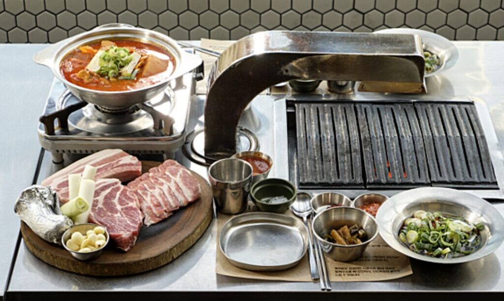 Korean barbecue features a combination of seasoned meats and an array of “banchan” (side dishes), creating a vibrant and interactive meal.