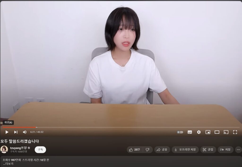 mr.Lee took advantage of her success and siphoned off about W4 billion (about W3 million). Tzuyang faced constant threats and physical abuse. It turned out that she had been subjected to psychological gaslighting by him for a long time.